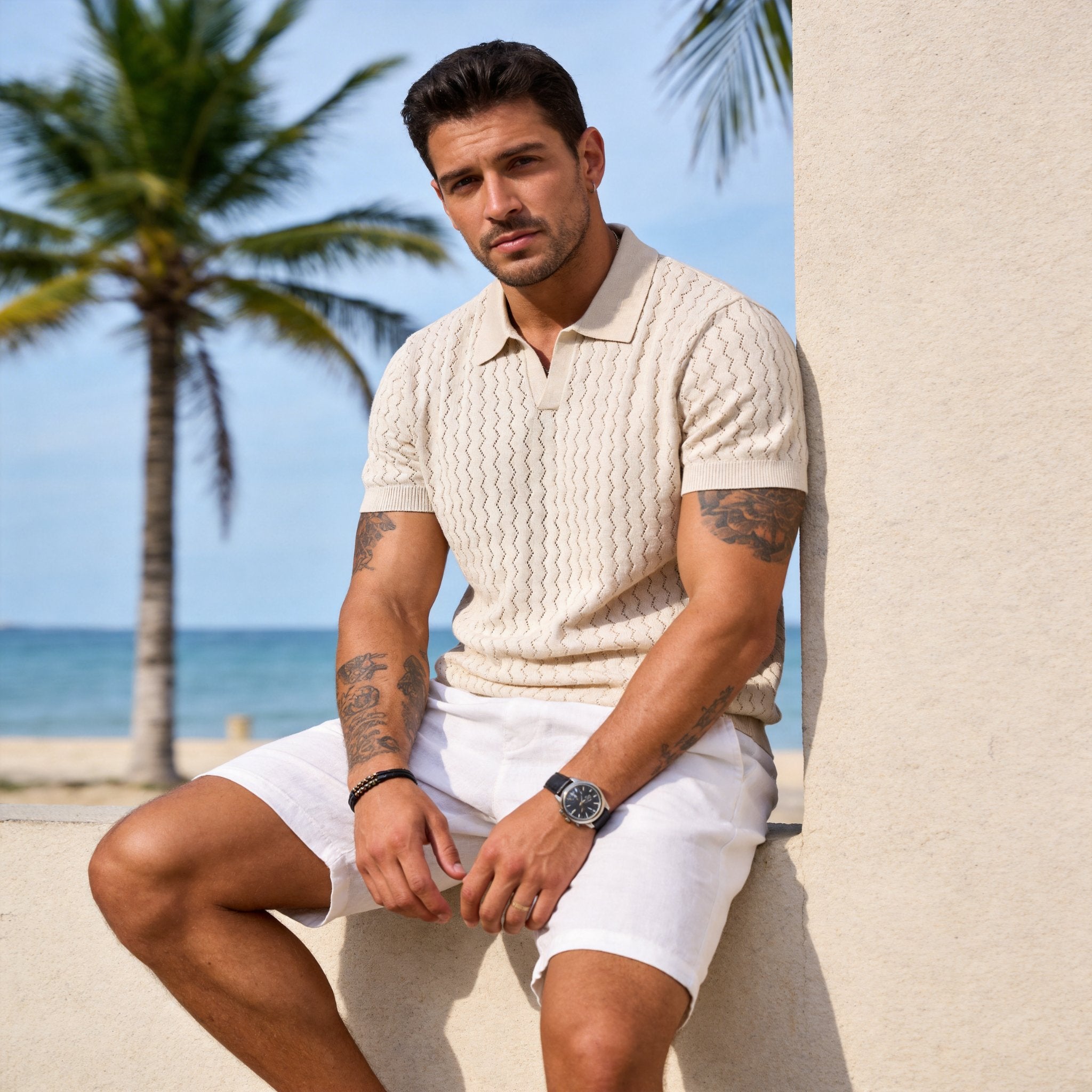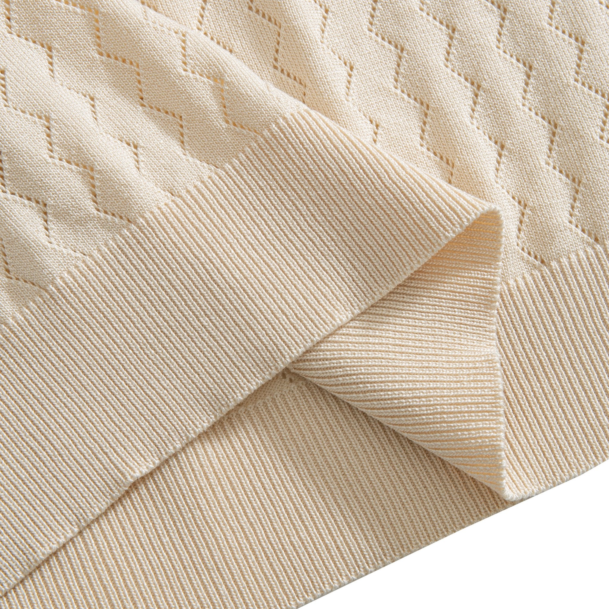 This men’s knitted polo shirt redefines warm‑weather comfort with its signature wavy zigzag hollow‑out knit – a three‑dimensional, sawtooth pattern that runs through the entire body. The intricate texture catches the eye, while the openwork weave delivers exceptional airflow, banishing the stuffy feeling typical of knitted tops. It’s the perfect blend of refined style and functional cooling.