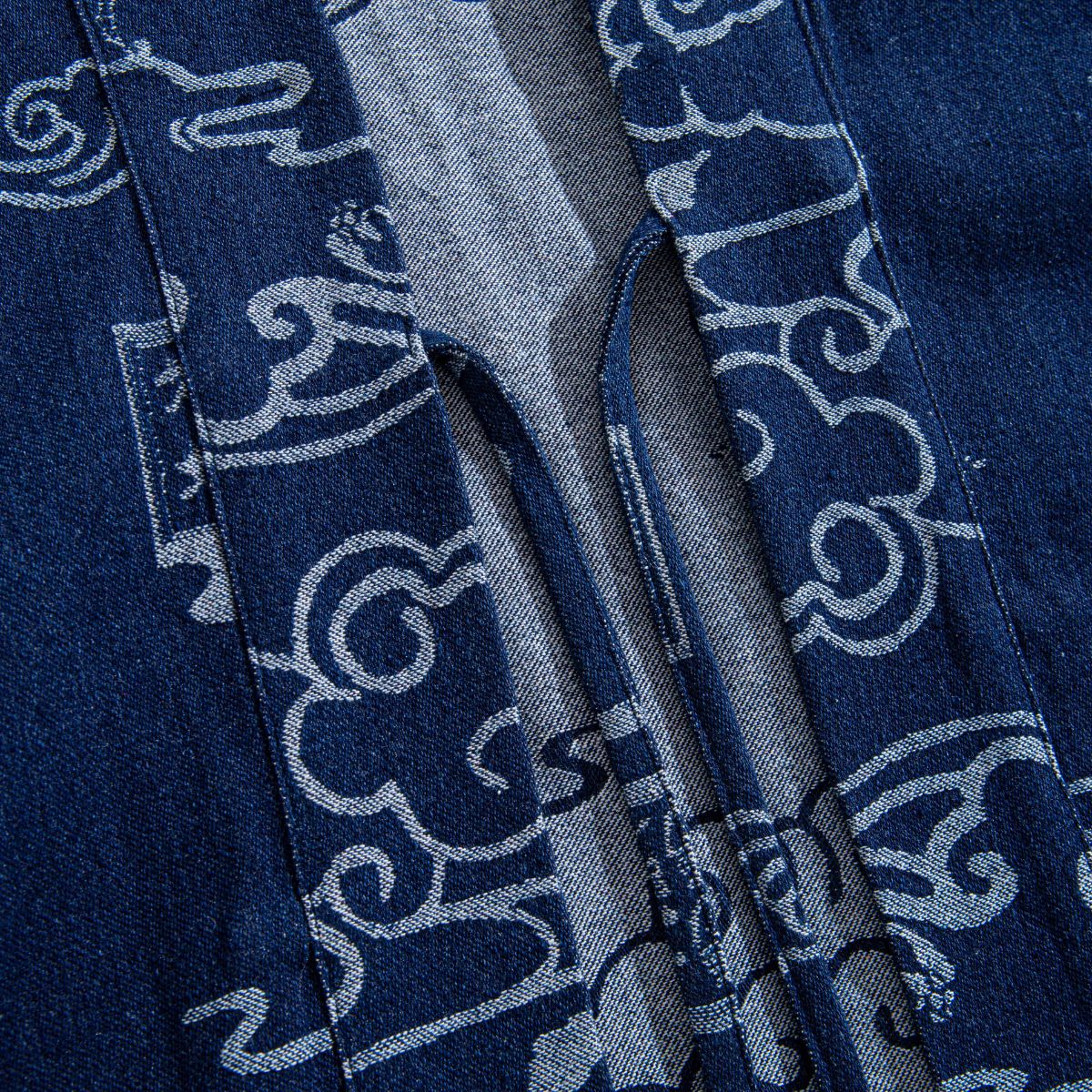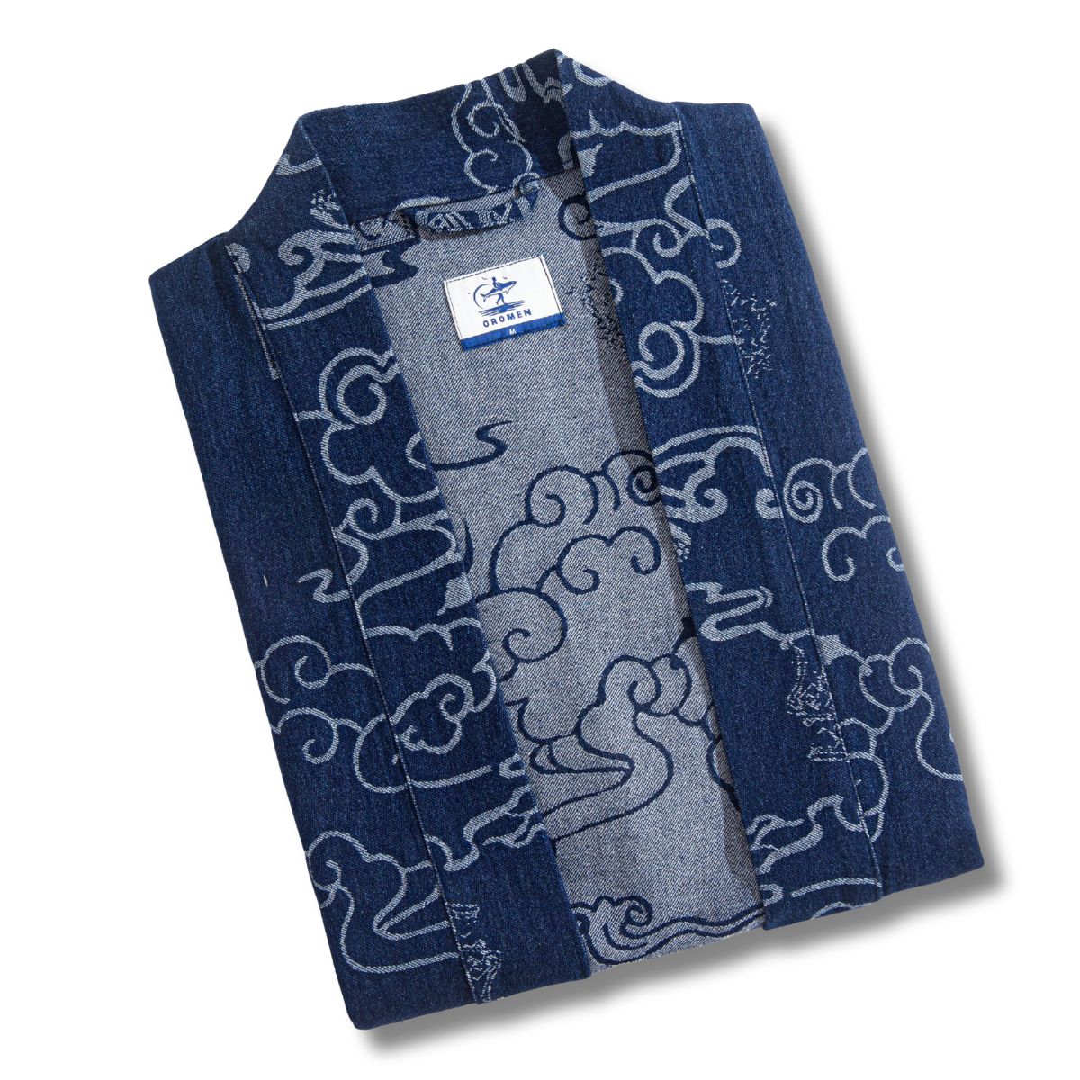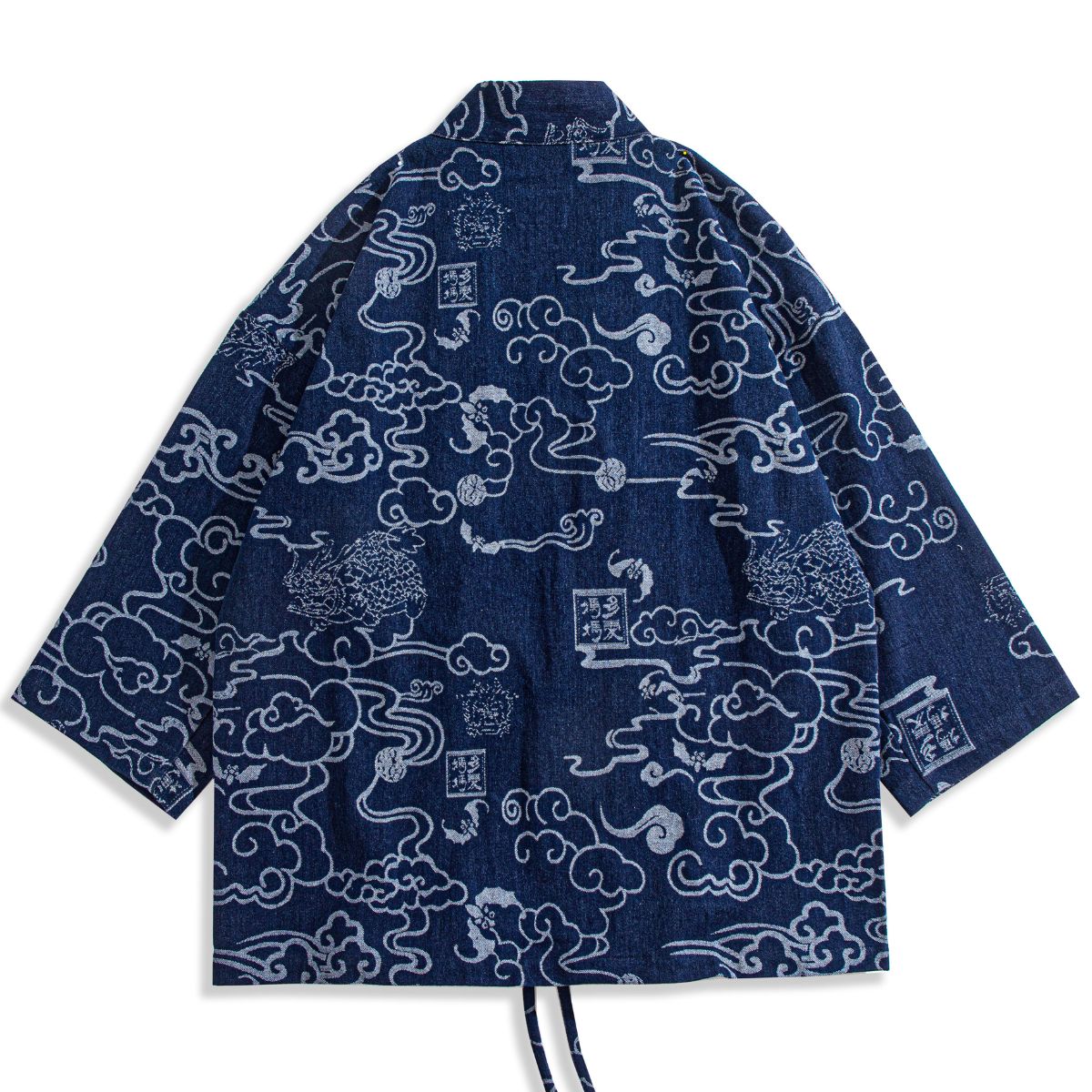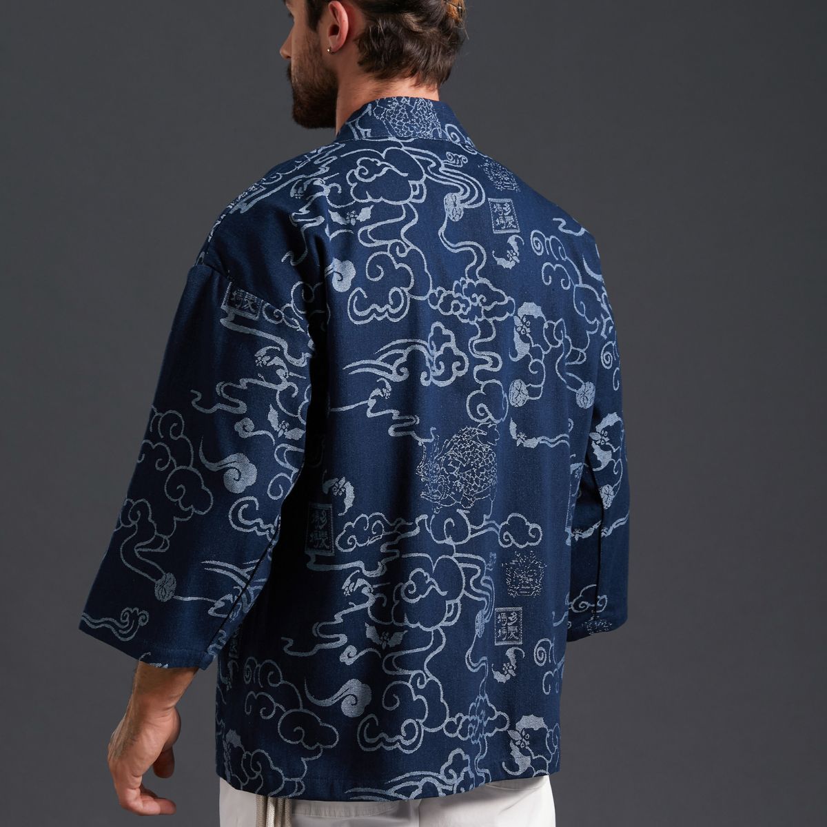 Carefully sewn from high-quality cotton and hand-dyed in the Japanese artist design – the iconic "Auspicious Clouds" pattern – this [Kimono Haori Jacket] presents a uniquely rustic texture due to its subtly uneven weave.