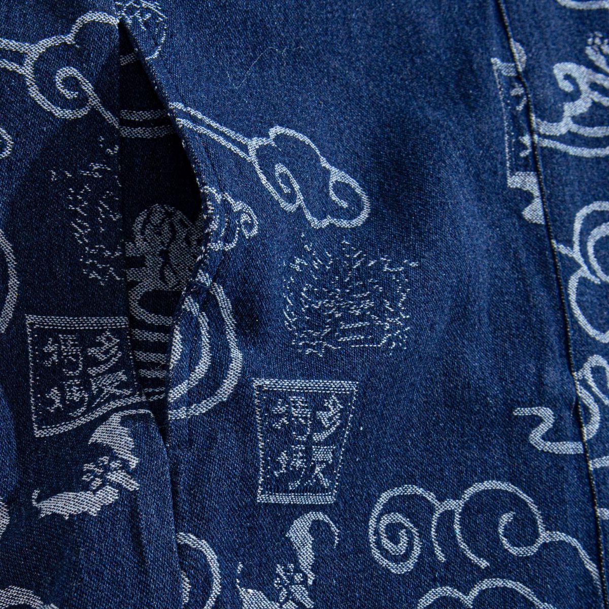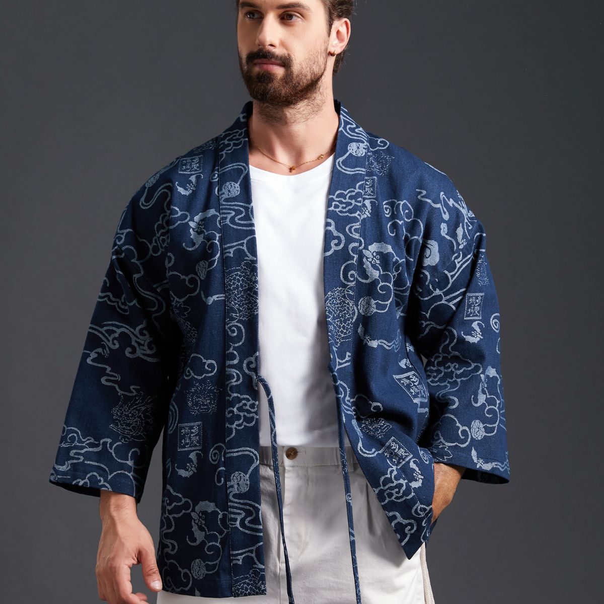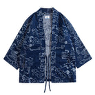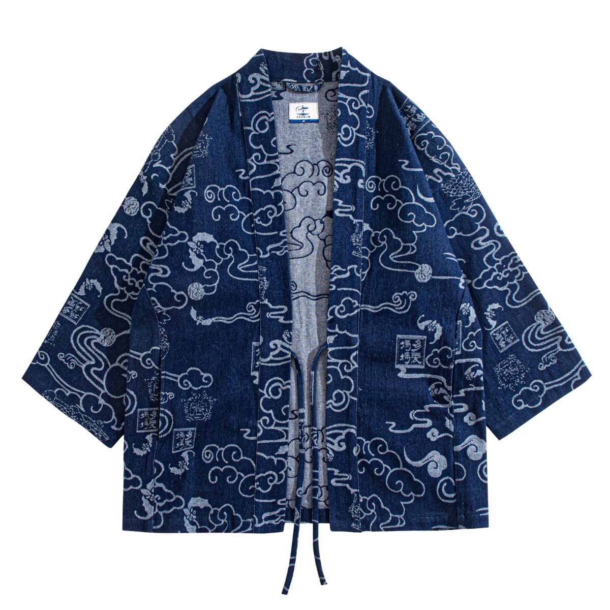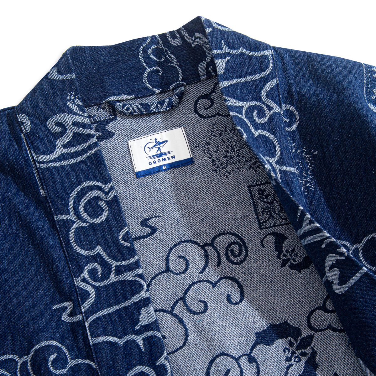 Carefully sewn from high-quality cotton and hand-dyed in the Japanese artist design – the iconic "Auspicious Clouds" pattern – this [Kimono Haori Jacket] presents a uniquely rustic texture due to its subtly uneven weave.